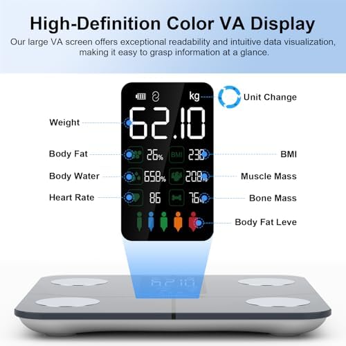 15 PHYSICAL DATA: weight, BMI, physique fats, physique water proportion, muscle mass, skeletal muscle frequency, bone mass, coronary heart fee, lean physique weight, organic age, proteins, BMR, coronary heart index, subcutaneous fats and visceral fats. The big VA show of good scale can immediately shows 8 knowledge similar to weight, weight, coronary heart fee and so forth., and immediately on the toilet scale with physique fats evaluation.