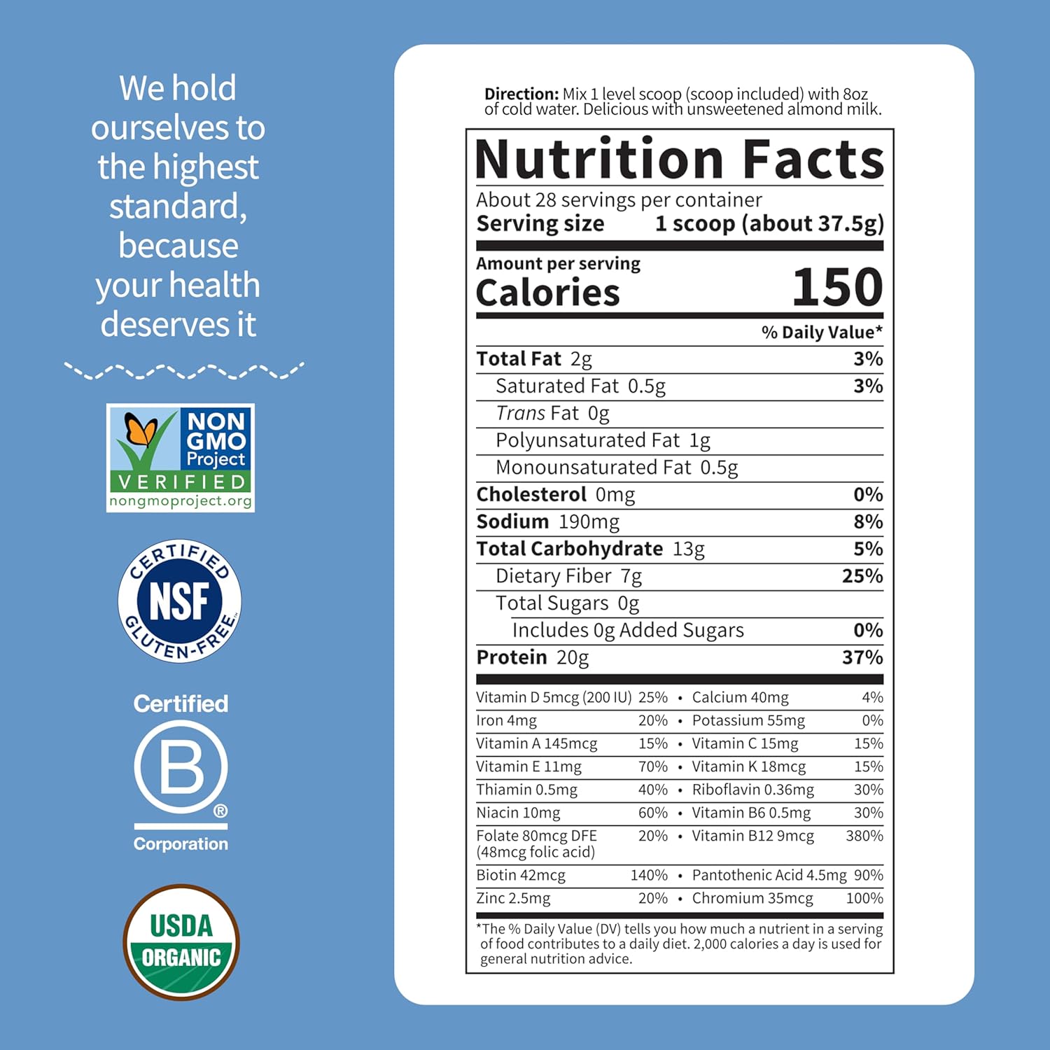 EXTRAORDINARY STANDARD: Our natural vegan protein powder shouldn’t be solely scrumptious however is supported by Third-Occasion Certifications — Licensed USDA Organic, Non-GMO Challenge Verified, Vegan, Kosher, NSF Licensed Gluten Free & NSF Contents Licensed
