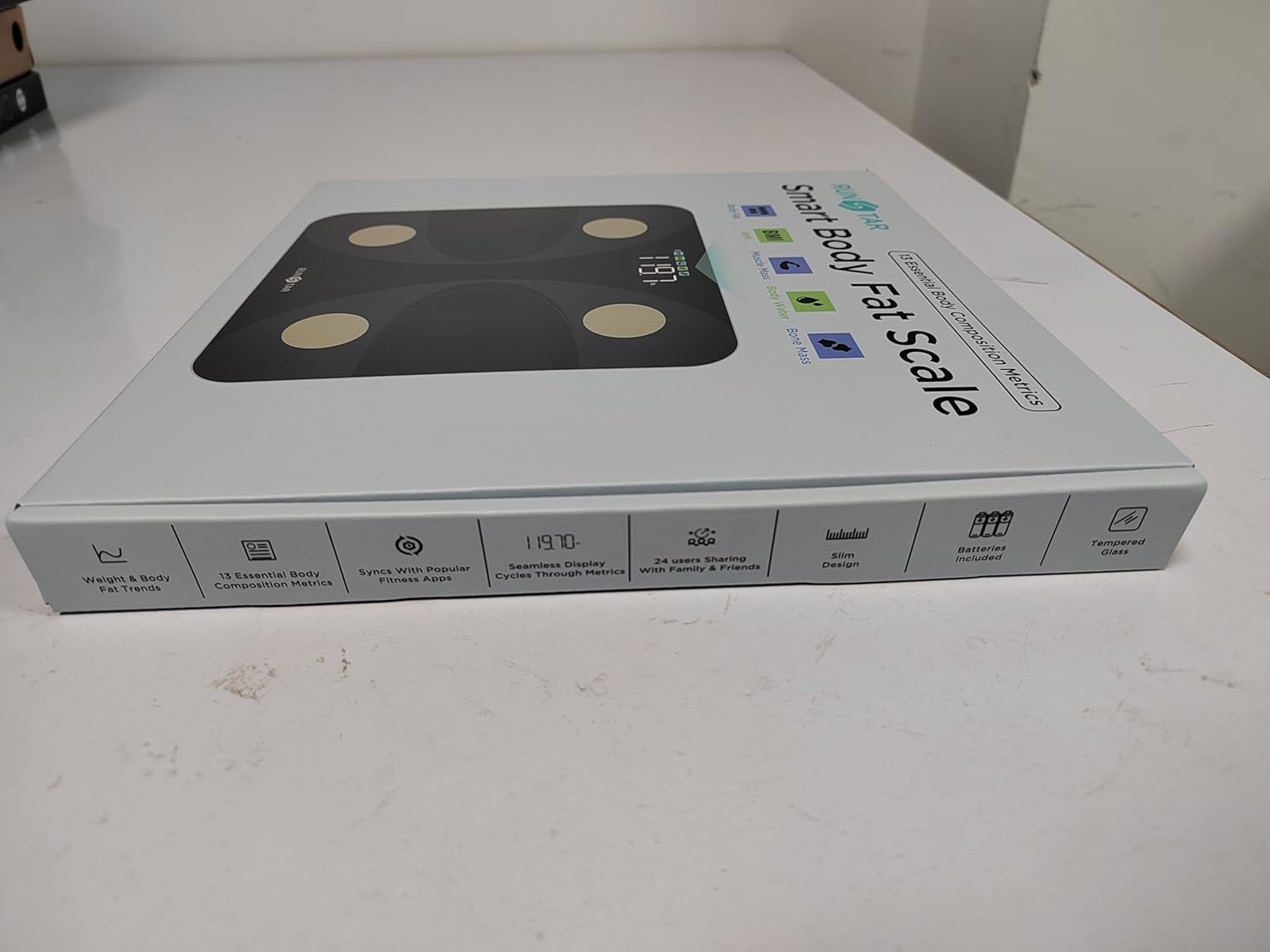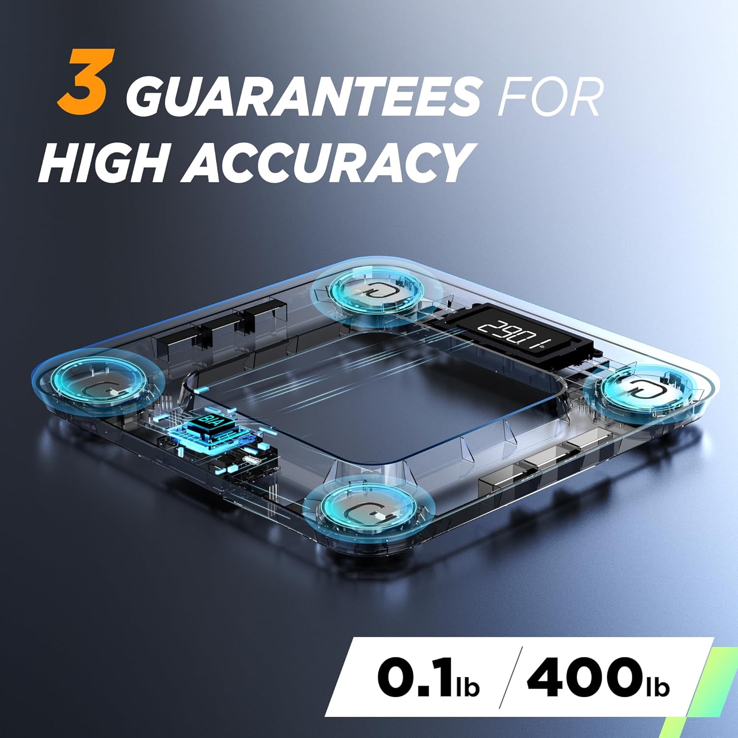 3 Guarantees for High Accuracy: This ultra-precision body fat scale, adopting the advanced BIA technology, is equipped with 4 high sensitive electrodes and 4 high precision G-shape sensors that have passed 100,000 times sensor performance tests to enhance accuracy.The scale ensures accurate measurement results to within 0.2lb/100g and has a maximum weight capacity of 400lb/180kg