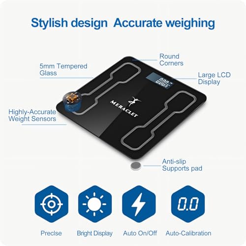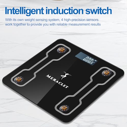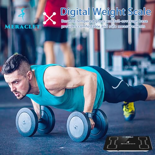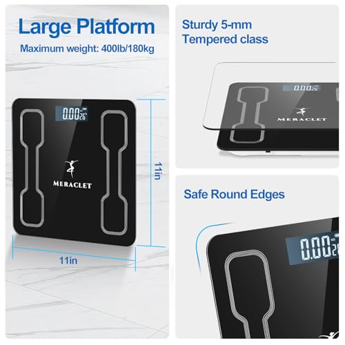 【Protected and Sturdy Platform】MERACLET physique weight scale comprised of high-quality supplies like tempered glass and ABS, 5mm explosion-proof tempered glass and full-coverage base design offers comfy and protected measurements, the scales for physique weight ensures sturdiness and longevity